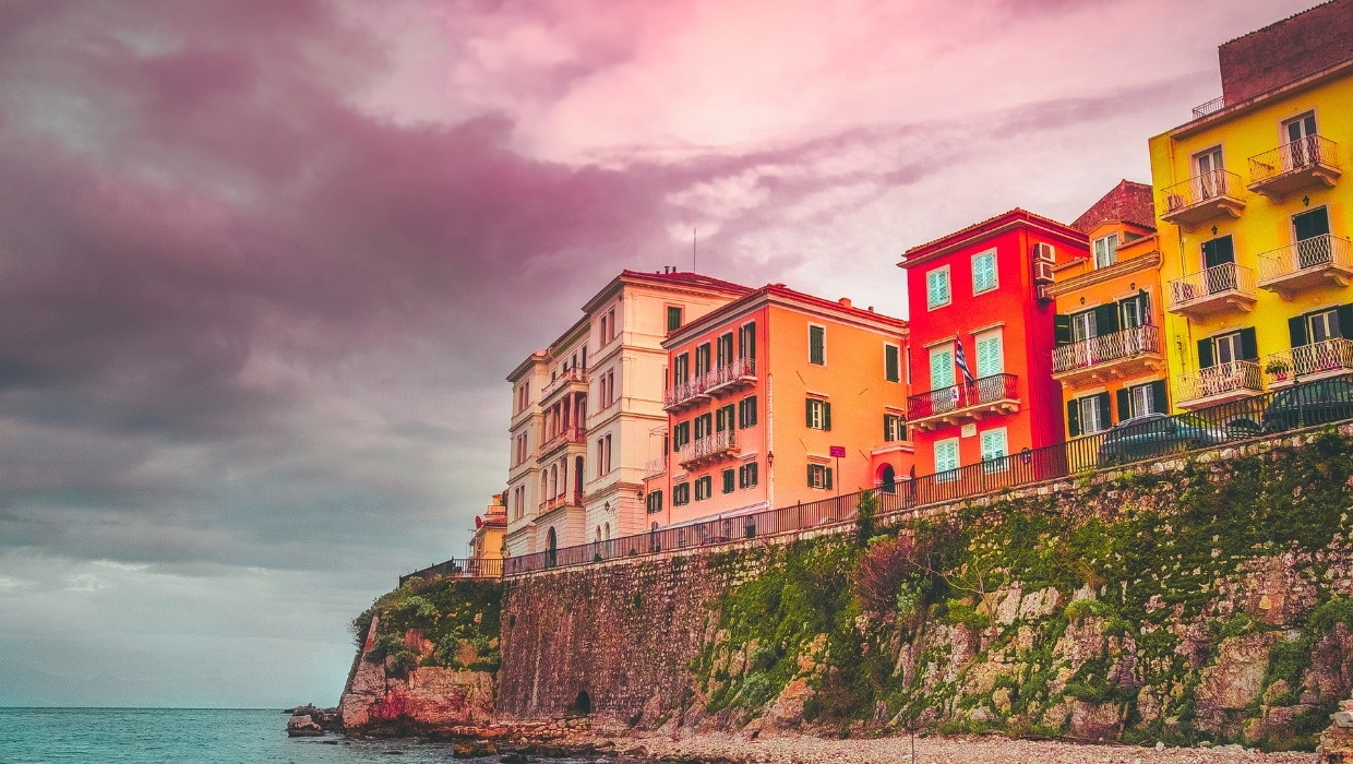 Navigați de-a lungul coaste frumoase of Vidos Island – Corfu Old Town – Pontikonisi, as the day ends with a spectacular display of colors in the sky.