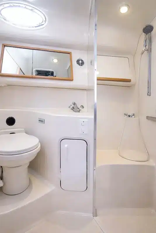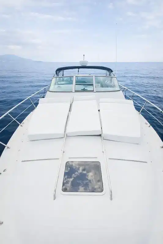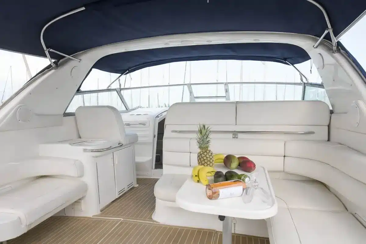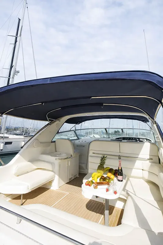 Outside, the sunbathing area and protective bimini offer the perfect balance of sunshine and shade, while the freshwater shower and washbasin provide added convenience after a refreshing swim. With its combination of luxury, technology, and generous space, the Passion V is the ideal yacht for full-day cruises, sunset trips, or exclusive private charters on the open sea.