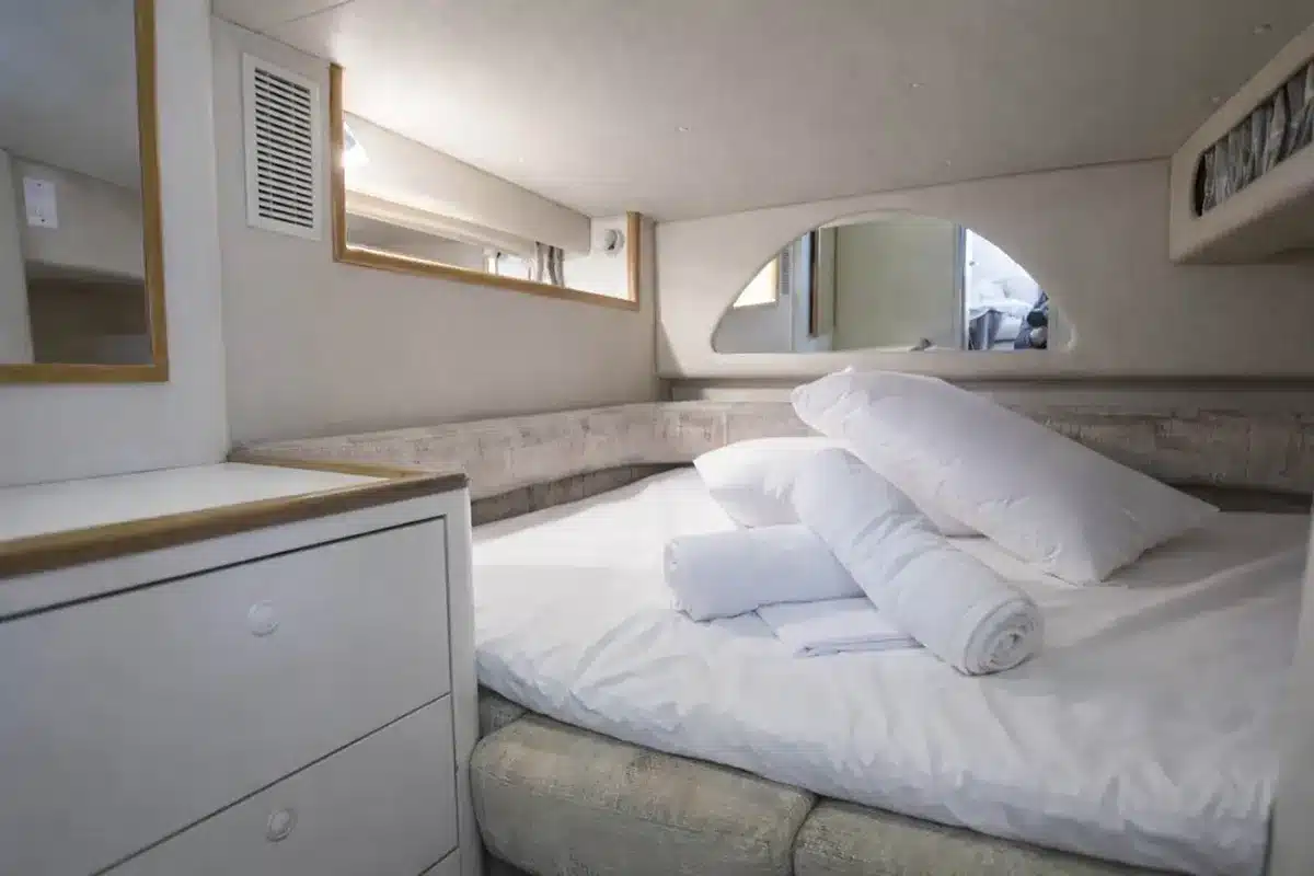 Measuring 12 meters (40 ft) in length and 4 meters (13 ft) in width, the yacht comfortably accommodates up to 12 guests plus 2 crew members, providing plenty of space for relaxation and entertainment. Powered by twin 330HP Cummins engines, the Passion V ensures a smooth, powerful ride, while advanced systems such as GPS plotter, autopilot, bow thruster, and electric windlass allow for effortless navigation and precise maneuvering.